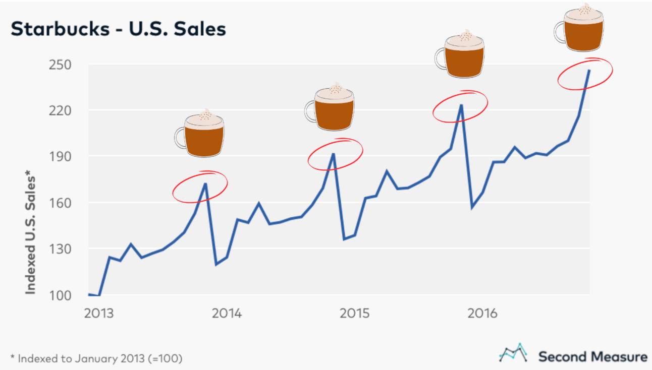 A cultural phenomenon that began more than 10 years ago, the PSL’s sales power is so strong that you can see easily spot on Starbucks’ sales chart when it’s launched: